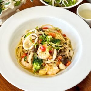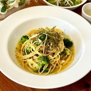 ◆蒸し鶏とブロッコリーの和風梅しそパスタ