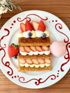 FLAT ミルフィーユ Sweets time 14:00~17:00 (L.O) 12月27日~「いちご」がスタート! ◆フラットミルフィーユ/いちご … 1,300円(税込 1,430円) ※素材の仕入れ状況によりお取り扱いのない場合がございます。 ※アレルギーをお持ちのお客様へ! 一部のメニューに、卵・小麦・乳・ナッツ類など アレルギーを含む食材を使用しております。 気になる食材がありましたらスタッフまでお声掛けください。